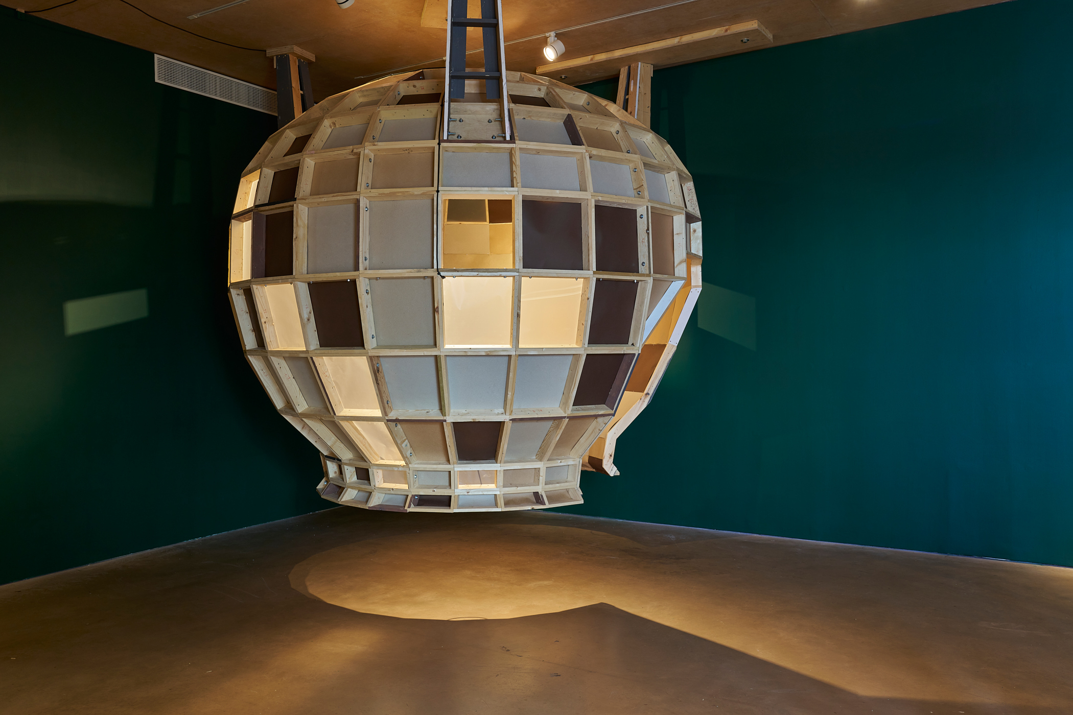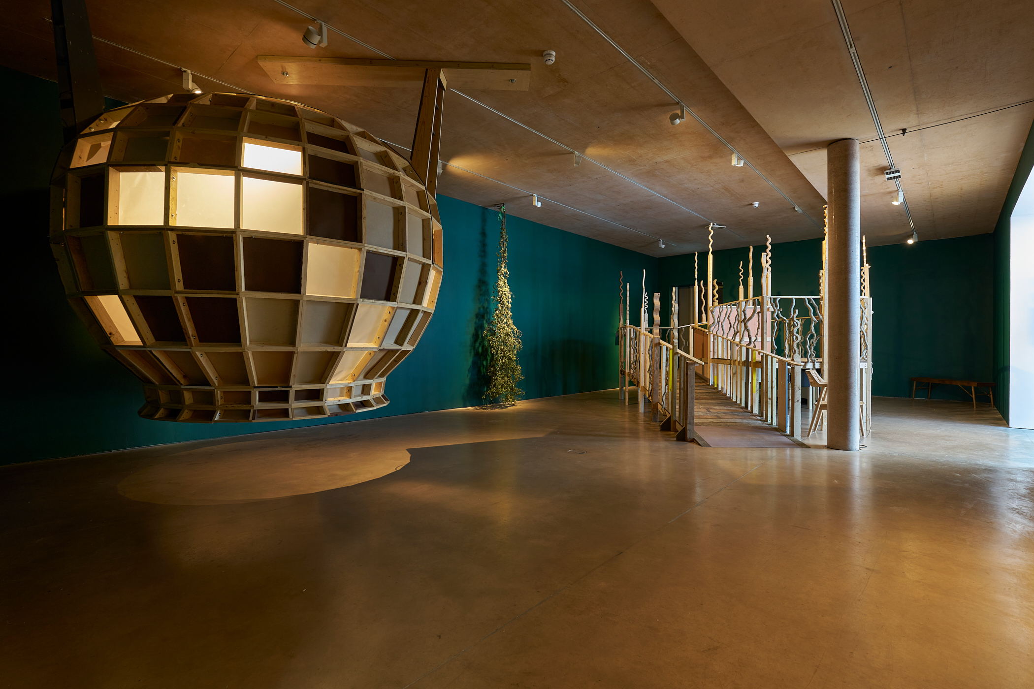 In Gallery 1, Lathwood presents two new large-scale sculptures, which visitors are invited to enter into or walk upon. The first, Another Round, a large upturned cauldron, references both the Somerset tradition of cauldron making and the vessels used by alewives to brew beer. A reimagined traditional alewife ballad plays inside—transformed into a modern electronic sound piece. The second sculpture, Down the Hatch, features a spiral walkway leading to a bubbling film. Shot from above, the footage shows a group of people wearing hats and holding props related to brewing. Their movements mimic the patterns of bubbles in the fermentation process. The structure houses carved, ‘wiggling’ uprights, referencing the sticks historically placed outside pubs to signal a drinking house (the earliest form of pub sign), and the stirring sticks used by alewives to concoct their brew.